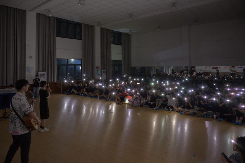 钢琴吉他弹唱《永不失联的爱》,深受大家喜爱,纷纷打开手电筒为表演者打call,闪闪灯光汇聚成一片茫茫灯海。