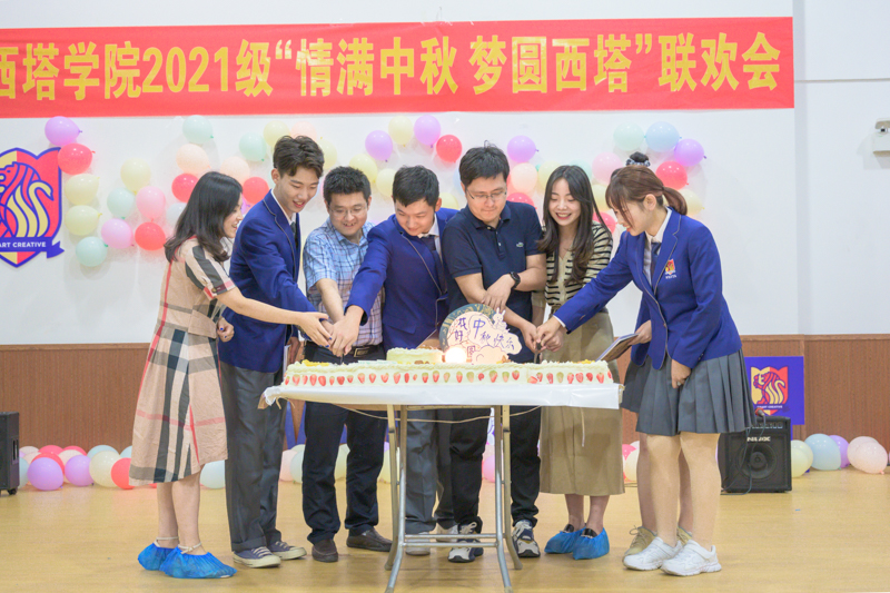 Westa食品科学社精心设计并自制的蛋糕让西塔学子一饱眼福,更为中秋晚会增添了丝丝甜蜜与美味。师生一同切蛋糕庆祝。
