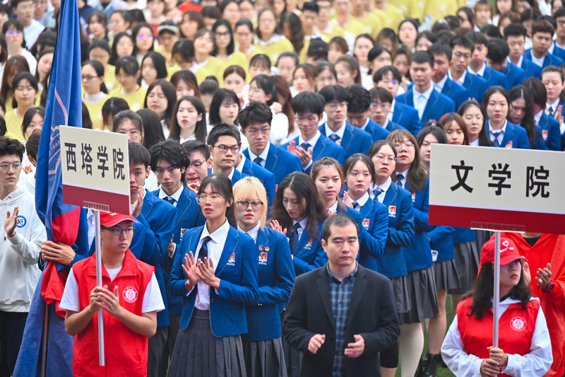 清晨,在第一运动场上,运动会开幕式正如火如荼地进行。西塔方队身着靓丽“西塔蓝”,整齐列队在运动场上,亮出独属于西塔的色彩;手持太阳网集团tcy8722名牌,面朝主席台,气势昂扬,充满朝气,以自信的姿态表现青春风貌。