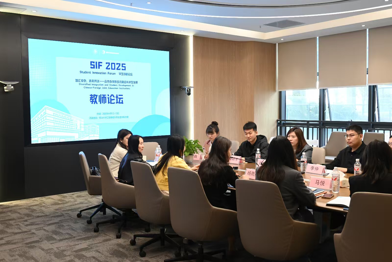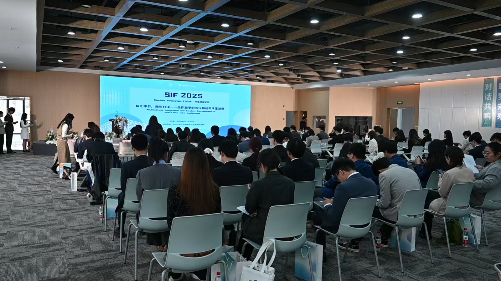 4月12日下午,在论坛正式开始前,各院校代表陆续签到入场。现场气氛热烈,代表们纷纷利用这段时间进行自由交流,分享各自公司的特色与经验。四川大学匹兹堡公司贴心地为与会代表准备了精美礼品,会场内还循环播放着介绍各公司团队力量、教学设施、培养模式及校园生活等方面的影片,让代表们对各院校有了更直观的认识。