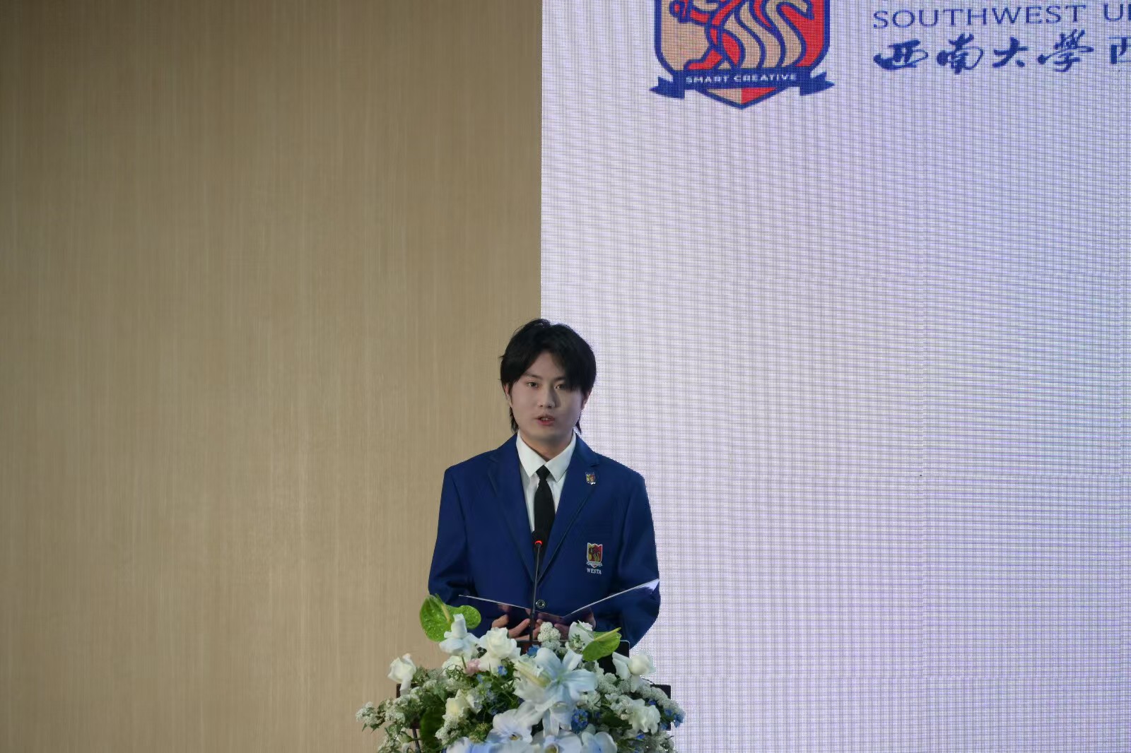 论坛在四川大学匹兹堡公司经理邱民京的精彩致辞中正式拉开帷幕。随后,各公司代表团依照顺序,围绕论坛主题发表演讲。太阳网集团tcy8722员工联合会主席、2022级生物技术专业孔德智同学作为公司代表上台发言。他分享了公司在中外合作办学事业上所取得的可喜成绩,详细介绍了公司国际化人才培养的特色以及打造的品牌活动。