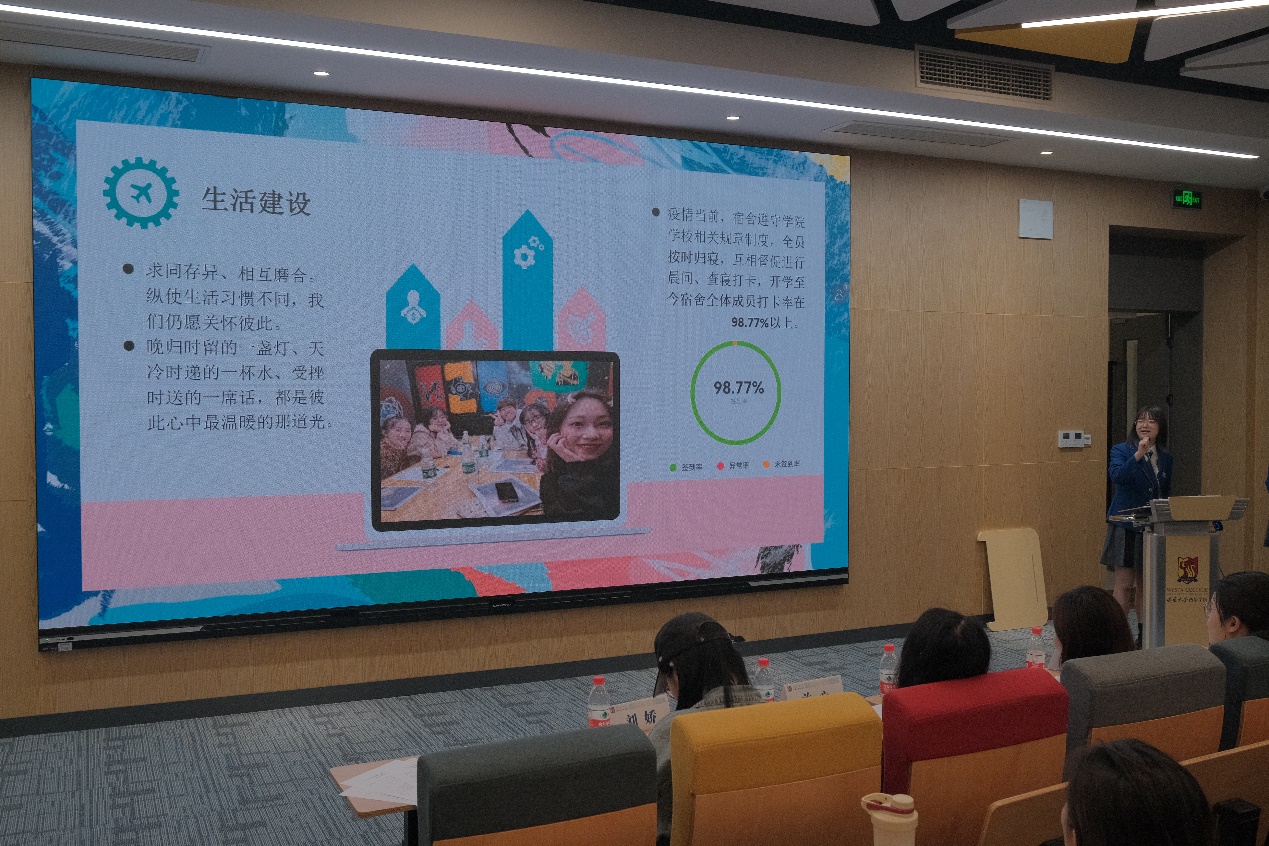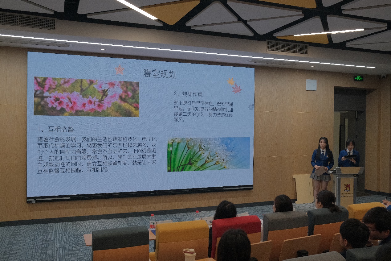 首先各寝室代表进行寝室风采展示,大家通过精美的PPT和VLOG视频,结合各寝室特色,将西塔学子的学习生活情况精彩地呈现。有的寝室通过获奖统计表和照片墙,立体展现了优美的寝室环境、浓厚的学风、和谐的寝风;有的寝室向大家展示了读书角、寝室公约、环境布置及文化建设情况;也有的寝室将同学们的生活点滴制作成VLOG,记录大家日常的欢乐时光。同学们还积极为寝室取名字,如“汤臣一品”“仙女睡务局”“乱世佳人”“云young青春 逐梦未来”。现场掌声不断,部分诙谐幽默的陈述赢来欢声笑语。