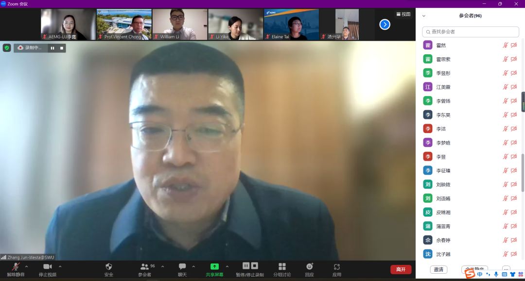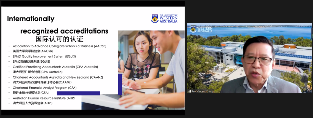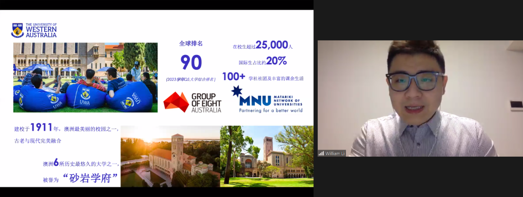 11月25日下午,公司2020级3+2项目出国宣讲会在线上顺利举行。本次活动邀请了西澳大学商公司会计与金融学Vincent Chong教授、分子生物科学公司高级讲师Alyssa Van Dreumel博士、西澳大学华南区域负责人William Li先生,太阳网集团tcy8722副经理张俊、国际项目管理办公室以及2020级经济学、生物技术专业全体同学及部分家长参会。