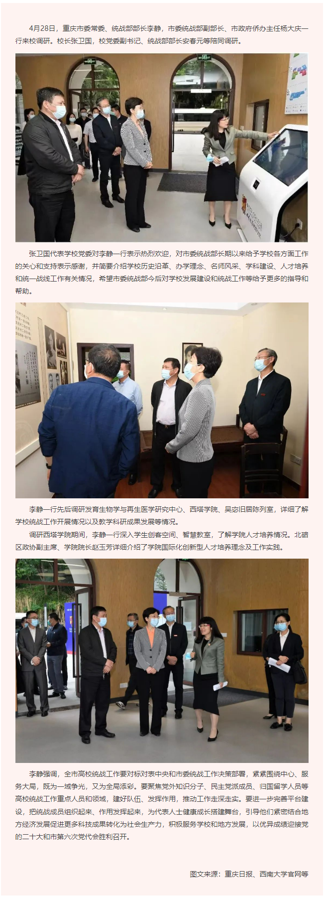 重庆市委常委、统战部部长李静来校调研