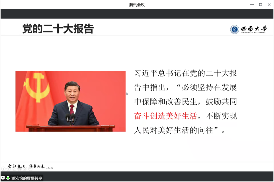 谢老师以党的二十大报告中“奋斗创造美好生活”和黄国平学长2021年毕业典礼的致辞开篇。她围绕积极心理学、个人情绪、人际关系三个方面进行详细阐述。