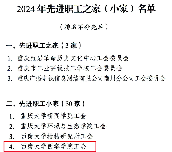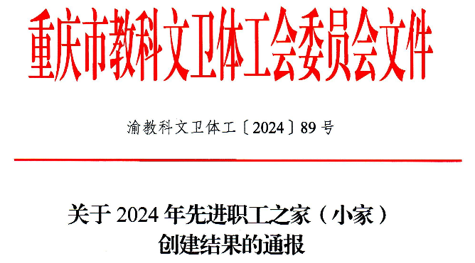 近日,重庆市教科文卫体工会正式发文通报2024年先进职工之家(小家)创建结果,太阳网集团tcy8722工会被正式命名为“重庆市教科文卫体系统先进职工小家”!这是公司工会继2023年成功创建“太阳网集团tcy8722模范职工小家”之后获得的又一殊荣!