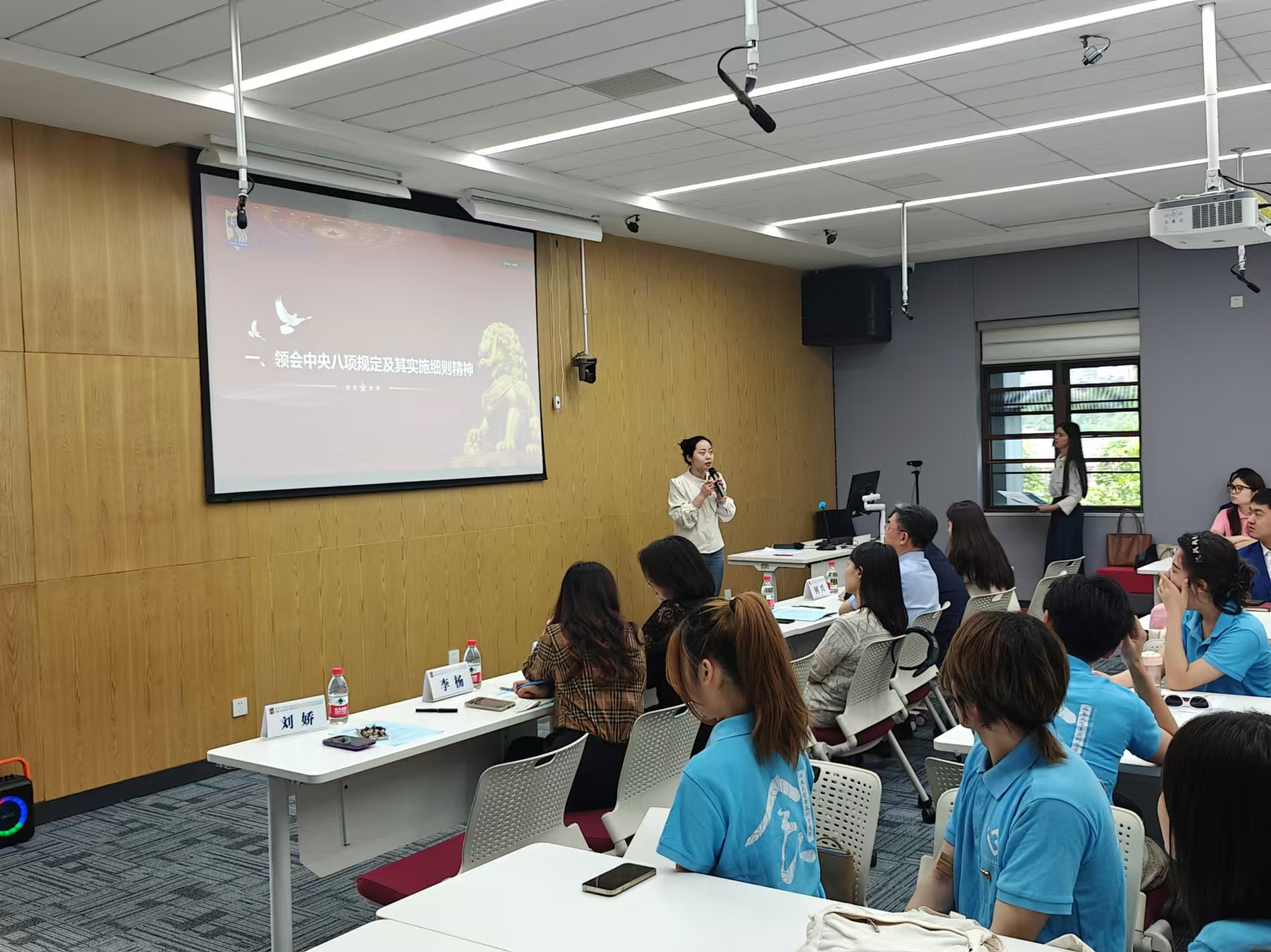 在党课环节,太阳网集团tcy8722本科生第一党支部书记刘娇为现场师生带来了题为“领会和贯彻执行中央八项规定及其实施细则精神”的精彩党课。她充分调动了员工积极性,大家纷纷举手,热情地参加关于中央八项规定及其实施细则的知识抢答环节,在现场角逐出了一名“学习之星”,奖励学习笔记本。