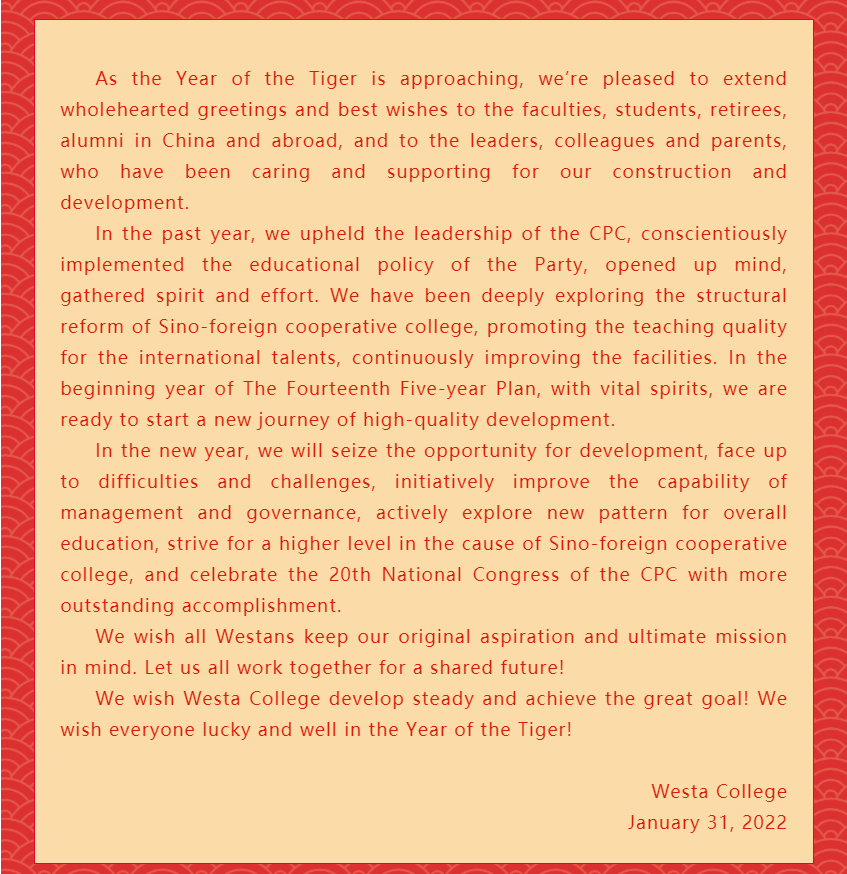 太阳网集团tcy87222022年新春贺词 | 2022 Lunar New Year Address from Westa College